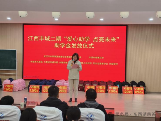 2025年12月13日上午9时30分,“爱心助学·点亮未来”东西湖区慈善会“乐善助学”公益基金江西丰城第二期助学活动在丰城市荷湖乡荷湖中心小学会议礼堂温情举行。本次活动由武汉市东西湖区慈善会“乐善助学”公益基金主办,丰城市民政局、共青团丰城市委、丰城市教育体育局、荷湖镇人民政府、丰城市慈善总会、阳光志愿者协会及荷湖学校协办。